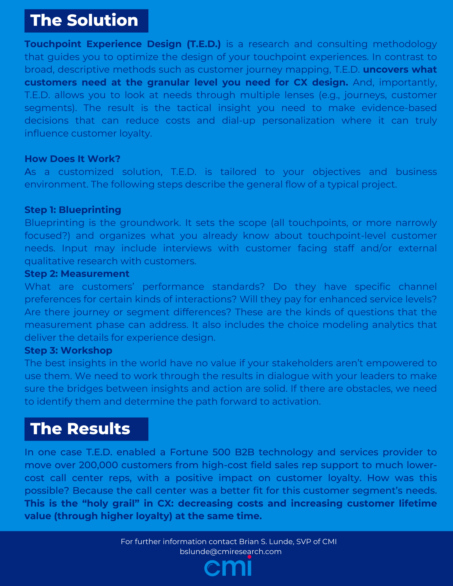 Touchpoint Experience Design (T.E.D.) is a research and consulting methodology that guides you to optimize the design of your touchpoint experiences. In contrast to broad, descriptive methods such as customer journey mapping, T.E.D. uncovers what customers need at the granular level you need for CX design. And, importantly, T.E.D. allows you to look at needs through multiple lenses (e.g., journeys, customer segments). The result is the tactical insight you need to make evidence-based decisions that can reduce costs and dial-up personalization where it can truly influence customer loyalty.