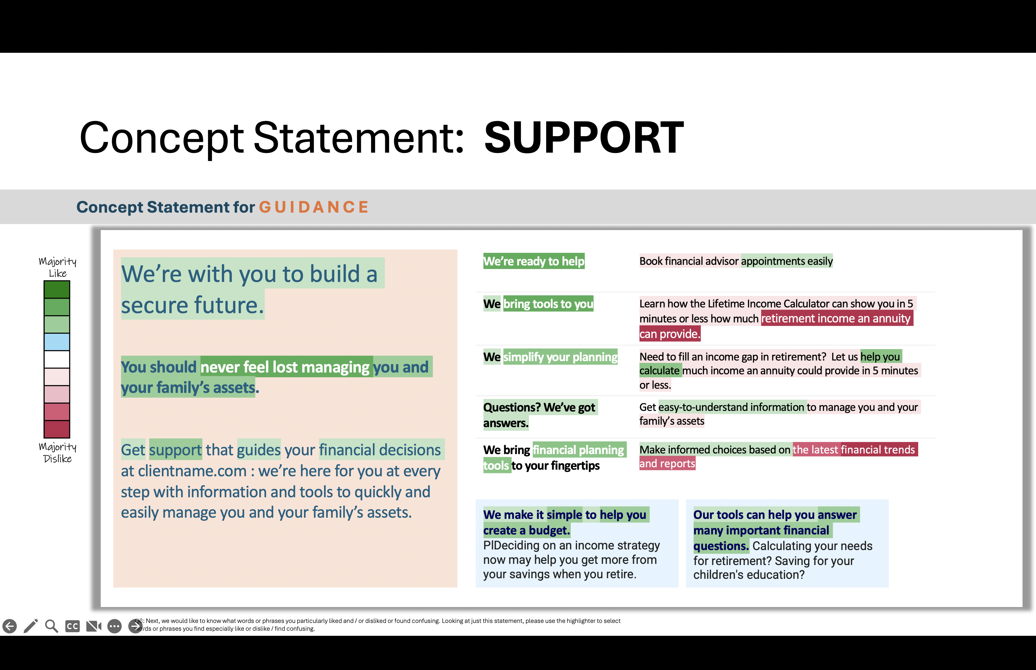 - Concepts from the Value Proposition were evaluated using a highlighter exercise that showcased the ‘words that matter’ in each statement.